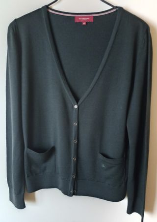 Elegante Cárdigan BURBERRYS en color verde caza, 100% lana merino. Cuello de pico, dos bolsillos delanteros, logo de la marca bordado en uno de ellos. Es una prenda clásica y atemporal, perfecta para llevar encima de una camisa o camiseta. Muy poco uso. Pequeño enganche en una de las mangas pasa desapercibido (se puede ver en una de las fotos) Medidas: Largo 60 cm; Ancho espalda (hombros) 41 cm; Ancho espalda (sisa) 54 cm; Largo de manga 64 cm Talla 42 Precio 43 € LAS FOTOS FORMAN PARTE DE LA DESCRIPCIÓN Puedes ampliar las imágenes o contactarme si tienes alguna pregunta; con gusto la responderé. Empaquetado cuidadoso