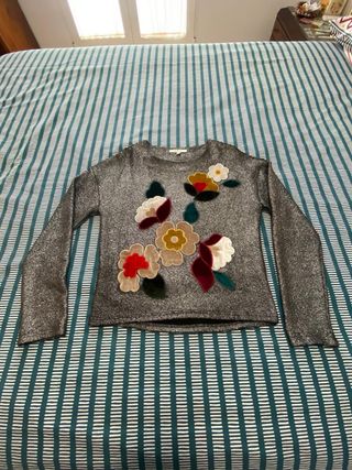 Top fiesta color plateado oscuro y aplicaciones florales de terciopelo en varios colores. Con forro interior. Manga larga. Talla 38 y tejido elástico. Medidas indicadas en las fotos. Nunca usado. Muy favorecedor y coqueto