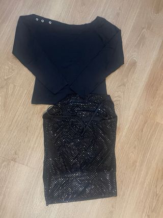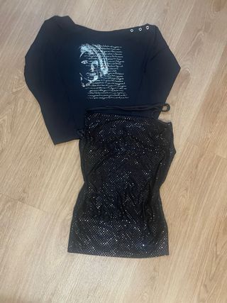 ¡Ideal para salir! Vendo lote de dos prendas negras súper combinables: 1. Top Halter Lentejuelas: Muy elegante y brillante. Se ata al cuello y el tejido es elástico (94% poliéster, 6% elastán) para un ajuste perfecto. 2. Camiseta Manga Larga: Diseño original con cuello asimétrico, detalle de ojales en el hombro y gráfico frontal plateado. Tejido cómodo (90% poliamida, 10% elastán). • Estado: Muy buen estado. • Talla: No indica, en una de las prendas pero equivale a una M.