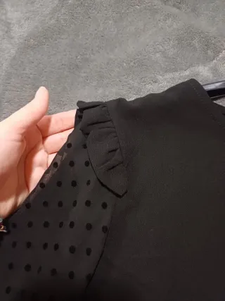 Elegante blusa negra de la marca October. Presenta un diseño con mangas de lunares y detalles de volantes en los hombros. - Mangas largas con estampado de lunares y transparencia - Cuello redondo. - Volantes decorativos en los hombros.