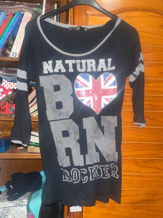 Camiseta negra con diseño Natural Born Rocker y corazón con la bandera británica. - Diseño Natural Born Rocker en la parte delantera. - Corazón con lentejuelas y la bandera del Reino Unido. - Mangas largas con detalles de rayas grises.