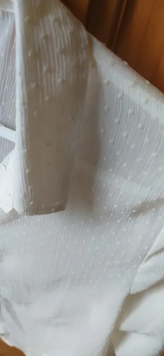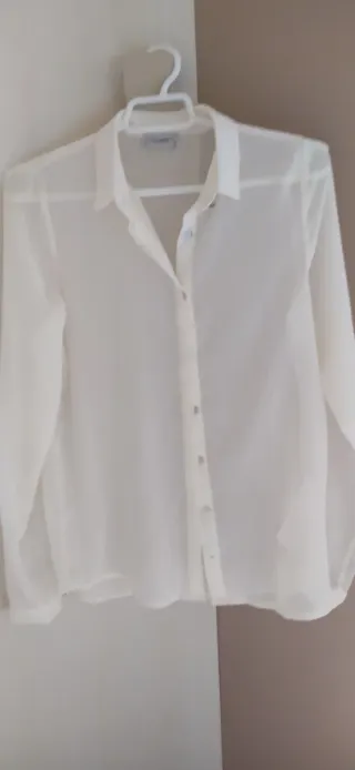 Blusa blanca de Mango con un diseño elegante y fresco. Pone talla xs pero en realidad es s/m - Mangas largas abullonadas. - Cuello redondo con detalle. - Cierre de botón en la parte delantera.