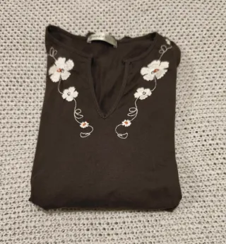 Camiseta de manga larga con un bonito bordado floral en la parte delantera. El diseño presenta flores blancas con detalles en naranja y tallos en hilo blanco. - Cuello en V. - Bordado floral en blanco y naranja.