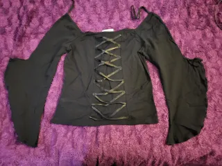 Top negro con diseño de corsé y cordones. - Cierre de cordones en la parte delantera. - Tirantes finos. - Corte asimétrico.