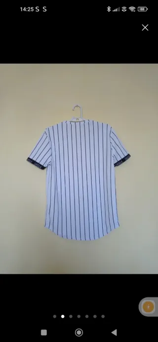 Camisa de manga corta con un diseño de rayas verticales en color beige. Presenta un cuello clásico y dos bolsillos en la parte delantera. Le faltan dos botones. Sin estrenar, porque cuando me di cuenta de que le faltaban esos botones la iba a llevar a arreglar pero nunca la llevé - Cierre de botones. - Mangas cortas con vuelta. - Dos bolsillos de parche en el pecho.