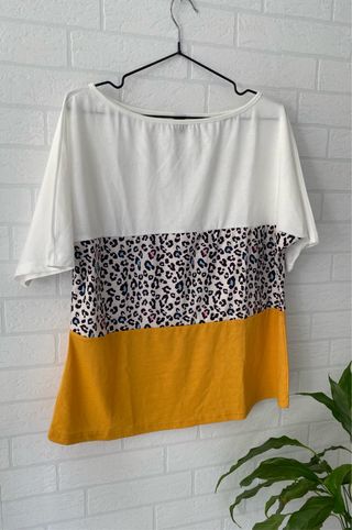 Camiseta de Shein con un diseño moderno y llamativo. - Combinación de blanco, amarillo y estampado de leopardo. - Corte holgado y cómodo. - Manga corta.