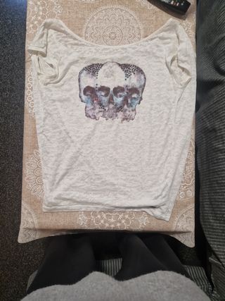 Camiseta blanca finita Pepe Jeans. Talla S/M. Semi transparente, con 3 calaveras. Estilo rockero.