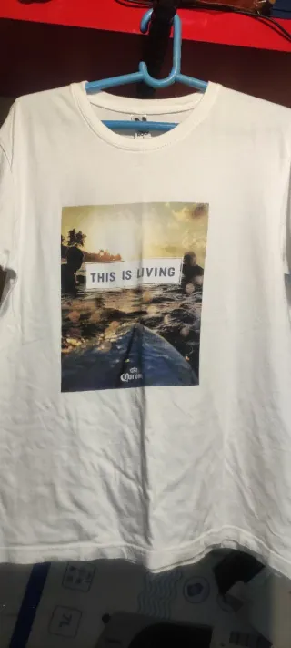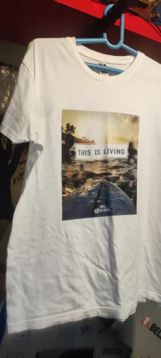 Camiseta blanca con estampado This is Living y logo de Corona. Aunque ponga L es una Talla M. Dejo medidas en fotos. - Diseño gráfico llamativo. - Estampado frontal. - Cuello redondo. Pedido min 3€ Más artículos escribiendo algeral en búsqueda general. Se hacen lotes en conjunto con los otros perfiles.