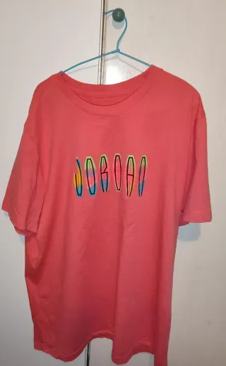 Camiseta de la marca Jordan en color rojo, con un diseño gráfico colorido en el pecho. Apenas ha sido utilizada. - Diseño gráfico con el logo de Jordan. - Color rojo vibrante. - Poco uso.
