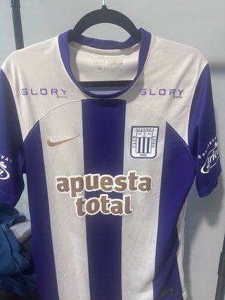 Camiseta oficial del Alianza Lima con diseño a rayas moradas y blancas. 2023 - Logo de Nike bordado en dorado. - Escudo del club Alianza Lima. - Inscripción apuesta total en el frente. - Inscripción GLORY en las mangas.