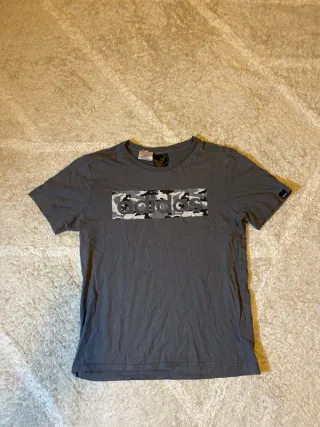 Camiseta de manga corta Adidas con un diseño moderno. - Estampado de camuflaje en el logo. - Color gris principal.