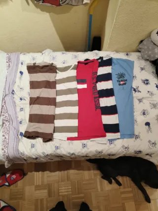 Pack de cinco camisetas de manga corta con diferentes diseños y colores. El pack completo a 30€, por unidad 7€ cada una. La talla de las camisetas es M-L - Camiseta de rayas marrones y beige. - Camiseta de rayas blancas y grises. - Camiseta roja con detalles blancos y logo. - Camiseta de rayas azules y blancas. - Camiseta azul con estampado de palmera y texto.