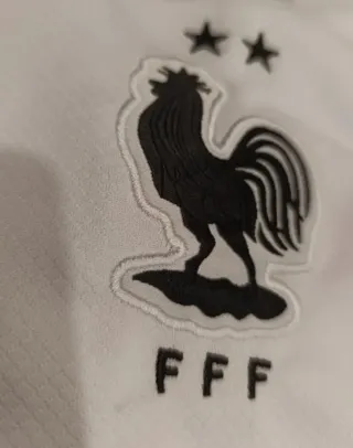 Camiseta de fútbol de la marca Jordan. - Diseño blanco con detalles en cuello. - Escudo de Francia con gallo y dos estrellas. - Logo de Jordan bordado.