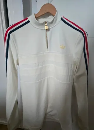 Polo de manga larga de Adidas en color blanco con detalles dorados. Un diseño clásico y deportivo. - Cuello alto con media cremallera dorada. - Logo de Adidas bordado en dorado en el pecho. - Rayas tricolores (rojo, azul marino y blanco) en los hombros. - Panel frontal con líneas horizontales texturizadas.