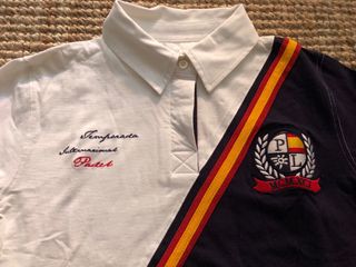 Polo de manga larga con un diseño moderno y deportivo. - Combinación de colores blanco y azul marino. - Detalles de franjas en amarillo y rojo. - Escudo bordado en el pecho. - Cuello tipo polo con botones. Largo: 62cm Sisa a sisa: 48cm