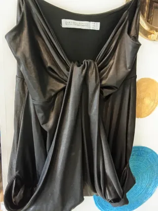 Elegante top de Zara con un diseño drapeado y nudo frontal. - Tejido con brillo sutil. - Tirantes finos. - Corte asimétrico. Un poco ablusonado abajo