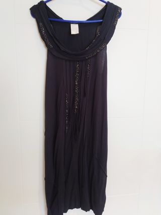 Vestido lencero ajustado. Cuello amplio. Tejido tipo camiseta algo trasparente. En la parte trasera y delantera lleva decoración de brillos. Para poner con leggins o medias. * Todas las prendas estan lavadas y repasadas por si tuvieran falta. * Tendras que confiar en mí y en tu buen ojo.
