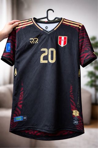 Camiseta de la selección de Perú con diseño moderno. - Número 20 en dorado. - Detalles de rayas rojas en las mangas y costados. - Escudo de la FPF en el pecho. - Logo RR en la parte frontal.