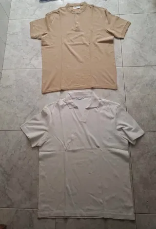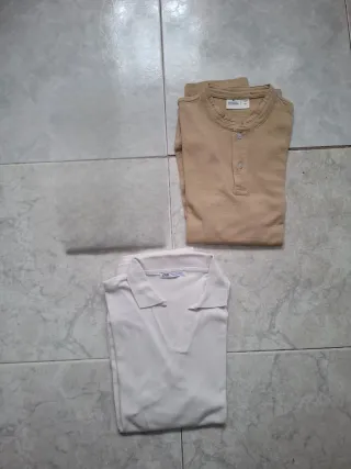 Lote de dos camisetas para hombre TALLA M POR 10E - Camiseta de color beige con cuello Henley y detalle bordado SPRINGFIELD - Camiseta de color blanco con cuello polo ZARA (es talla S pero lo pongo como talla M porque da más talla)