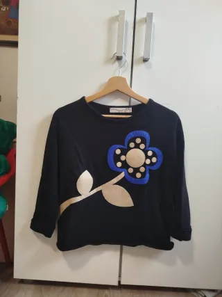 Camiseta de manga larga con un llamativo diseño de flor. - Diseño de flor con pétalos azules y centro dorado. - Hojas y tallo en color dorado. - Cuello redondo.