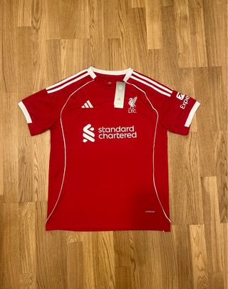 Camiseta de fútbol del Liverpool FC. - Color rojo. - Logo de Adidas y escudo del club. - Patrocinador Carlsberg.