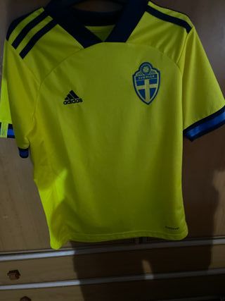 Camiseta de fútbol de Suecia - Diseño oficial de Adidas. - Escudo de Suecia bordado. - Detalles de las franjas en las mangas y cuello.