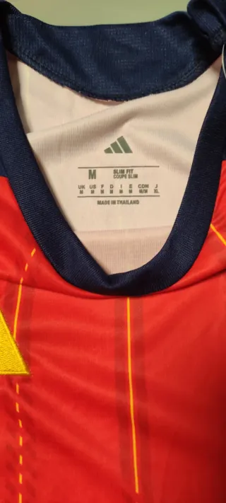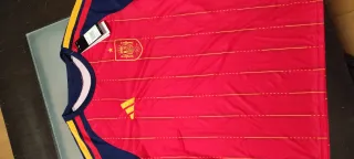 Camiseta de la selección española de fútbol, para el mundial de 2026 con un diseño vibrante y detalles icónicos.tengo también en talla S, nuevas con las etiquetas - Mangas de color azul. - Rayas verticales rojas y amarillas. - Escudo de la selección bordado. - Logo de Adidas en amarillo.