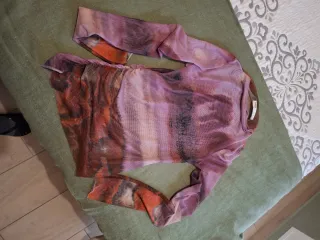 Camiseta de gasa transparente con manga larga. - Diseño con efecto tie-dye en tonos morados y rojizos. - Tejido ligero y traslúcido. - Talla S.