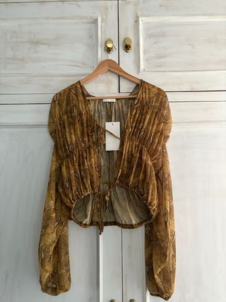 Elegante blusa de Zara con un estampado llamativo. - Diseño con escote en V. - Cintura fruncida con cordón. - Mangas largas abullonadas.