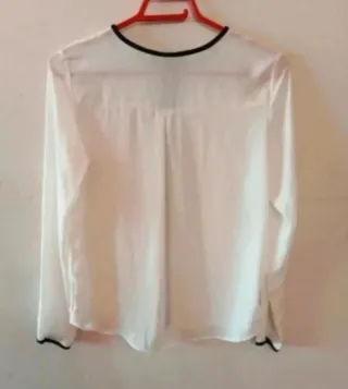 Blusa elegante de manga larga con detalles en negro. - Cuello redondo con abertura. - Ribete negro en cuello y puños. - Tejido ligero y vaporoso.