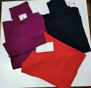 Conjunto de tres jerséis de cuello alto en talla S. Incluye prendas en color morado, negro y rojo. - Diseño de cuello alto. - Manga larga.