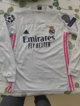 Camiseta de manga larga del Real Madrid, talla S - Manga larga, Marca blanca, usada pero bien conservada, con la serigrafía de la champions - tal cual foto - Diseño blanco con detalles rosas en los laterales. - Logo de Adidas y escudo del Real Madrid. - Parches de la Champions League y Respect en las mangas.