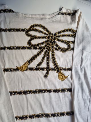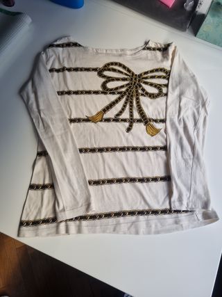 Camiseta elegante de Cortefiel con un toque de brillo dorado.Sin estrenar.Adorno dorado en el centro y frontal del camiseta de manga larga.Talla S.Da talla
