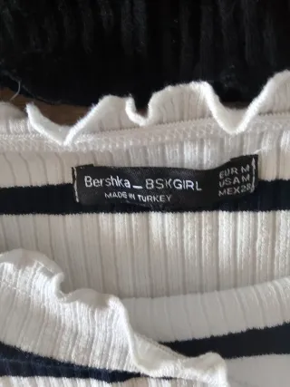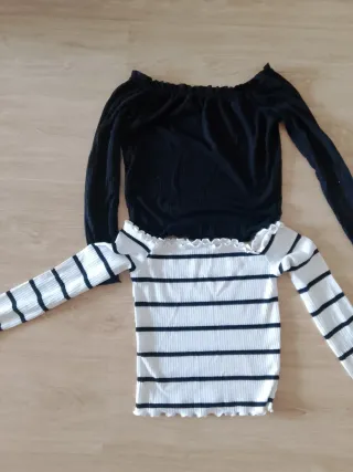 Conjunto de dos camisetas con diseño off shoulder. Talla S Cada 1€ unas - Camiseta negra de manga larga. - Camiseta de manga larga a rayas blancas y negras.