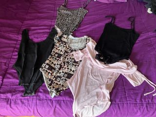 Conjunto de cinco bodies con diferentes diseños y colores. - Un body negro de tirantes finos. - Un body negro con escote cuadrado. - Un body con estampado de Mickey Mouse. - Un body negro de manga larga acanalado. - Un body rosa de manga larga acanalado con cordones. Alguno sin usar, resto apenas uso, talla S/M