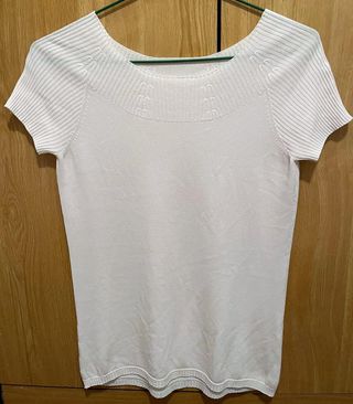 Camiseta de punto ceñida con relieve en escote y mangas. Básica y versátil. Color blanco con ligero tono rosáceo, combina con todo. Usada 3 o 4 veces en muy buen estado. Corté la etiqueta pero es una talla S 60 cm de largo y 38 de hombros (de sisa a sisa)