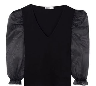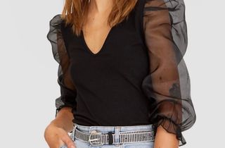 Camiseta negra con mangas largas de tul semitransparentes y hombros abullonados. Escote pico. De Stradivarius, talla S. Nueva a estrenar.