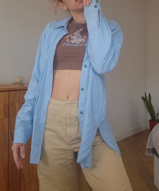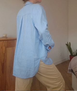 Camisa de manga larga en color azul. Diseño holgado y moderno. - Cuello camisero. - Puños abotonados. - Bajo redondeado.