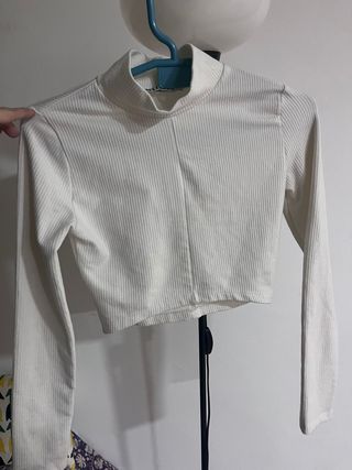 Top corto (crop top) de color blanco roto con tejido de canalé. Cuello alto ligero y manga larga. Talla S.