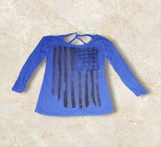 Camiseta de manga larga para niño, con diseño de bandera de Estados Unidos. La camiseta está en buen estado. - Talla: S - Diseño: Bandera de Estados Unidos en negro sobre fondo azul.