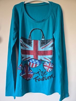 Camiseta de manga larga con un diseño original y llamativo. - Estampado de estilo collage con imágenes. - Detalle de pedrería en la parte inferior. - Cuello redondo. - medidas: largo 60 cm, ancho 43 ( de sisa a sisa)
