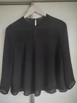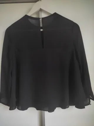 Elegante camisa negra de Bershka. - Diseño con cuello redondo. - Manga larga. - Cierre de botón en la nuca. - Tejido ligero y vaporoso.