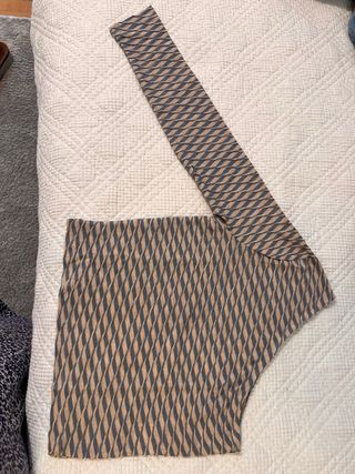 Preciosa camiseta de la marca Noon, sin usar, en talla S. Es de manga larga asimétrica y tiene un diseño precioso en tonos beige y azul. - Diseño único de manga asimétrica - Estampado elegante en tonos beige y azul - Tejido suave