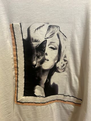 Camiseta blanca con un diseño gráfico de Marilyn Monroe y un gato. - Manga larga. - Cuello redondo. - Estampado frontal.