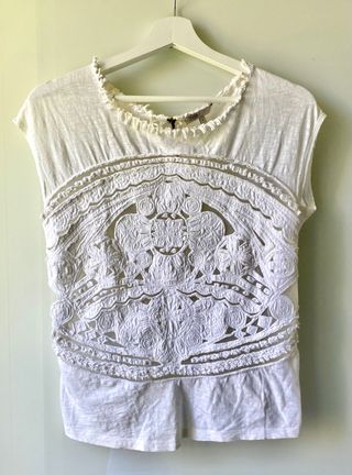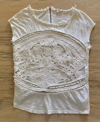 Top Maje de algodón blanco con frente calado talla 1. Equivale a una S o S/M. Mide 43 cm de axila a axila y 61 de largo. Poco uso. En la manga izquierda por atrás (tres últimas fotos) tiene un pequeño cosido casi imperceptible por un enganche que hice el día que la estrené.