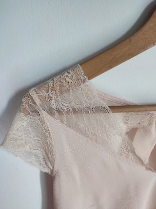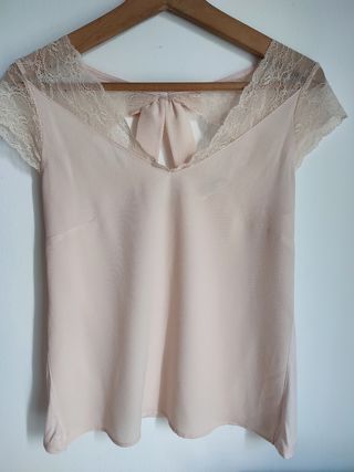 Camiseta rosa de manga corta con puntilla y preciosa espalda con un lazo. La parte delantera es de tejido como de blusa y la parte trasera es de algodón, un diseño muy característico de la marca Naf Naf. Tiene una pequeña manchita de pintauñas en la espalda (foto) que quizás se le puede quitar. Queda preciosa pero a mí ya me queda grande. Talla S 36. Medidas: 45 cm pecho x 60 cm largo.