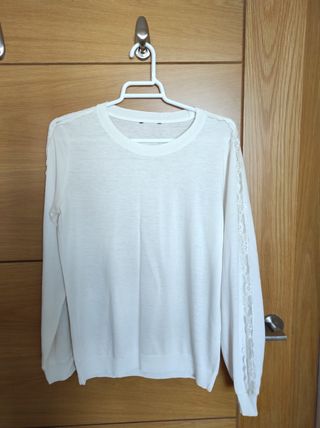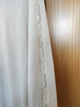 Camiseta manga larga. Color crudo. Nueva a ESTRENAR.Talla S. Viscosa. Tacto suave. Con delalles de encaje a lo largo de la manga. Puño en mangas. Y cenefa en cintura.