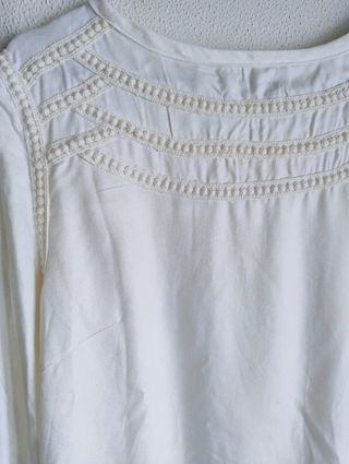 Preciosa blusa de Zara en color blanco roto. Es una prenda delicada y elegante, perfecta para ocasiones especiales. - Talla: S- 36 - Manga larga - Detalle de encaje floral - Cuello redondo - Botón trasero