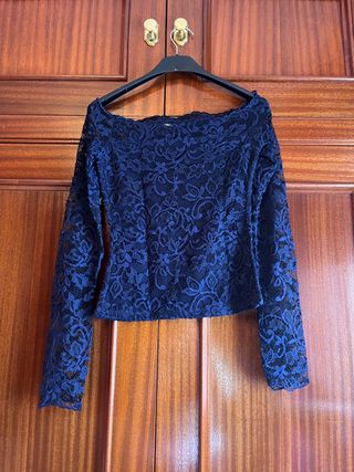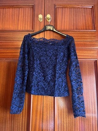 Camiseta de manga larga, de encaje por ambos lados, lleva forro por debajo, cuello de barco, color azul marino, talla S Comprada en Stradivarius