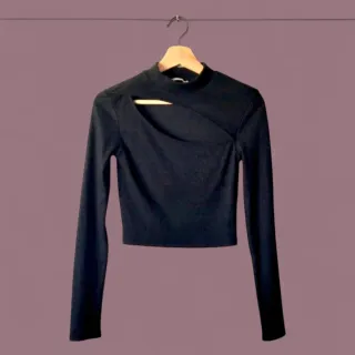 Camiseta de manga larga con un diseño moderno y atrevido. - Cuello alto. - Apertura frontal asimétrica. - Tejido acanalado. Color: negro Marca: pull&bear Estado: muy bueno Largo: 47cm Hombros: 36cm Talla: EUR S, USA S, MEX 26 Material: 79% poliéster, 20% viscosa, 1% elastano